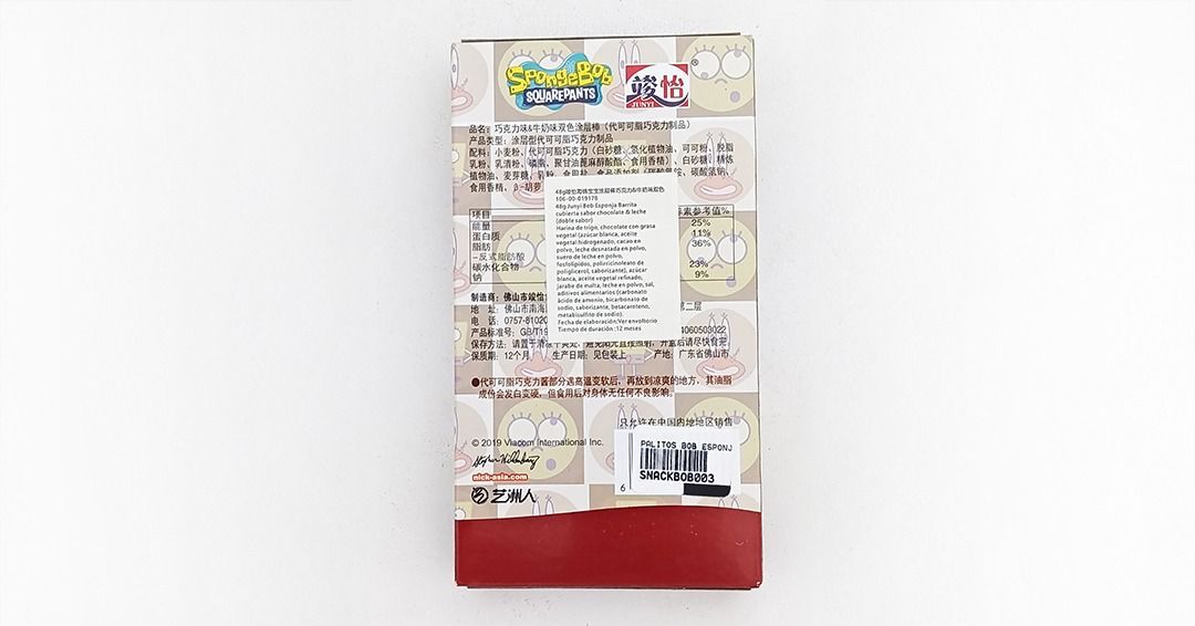 Informe de Laboratorio Nº 53161: referido a Acta de Toma de Muestra Nº 20718, Producto Barrita Cubierta sabor chocolate y leche, marca Junyi Bob Esponja, contenido 48 gramos. Lote 19/09/2025. Fecha de elaboración 19/09/2025. Validez 18/09/2026.